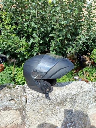Casco de moto en acabado negro mate, completamente nuevo. - Visera transparente. - Cierre de seguridad. - Ventilación superior.