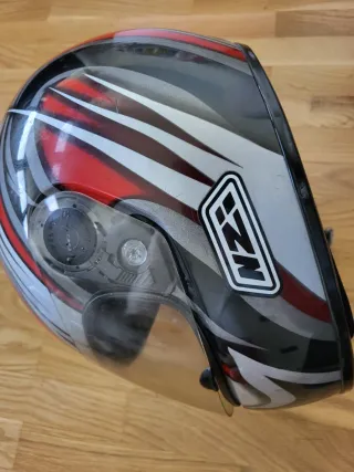 Casco integral de la marca Nzi con un diseño llamativo. -La visera no cierra del todo, se ve en la foto. - Diseño con detalles en rojo, plateado y negro. - Visera transparente.