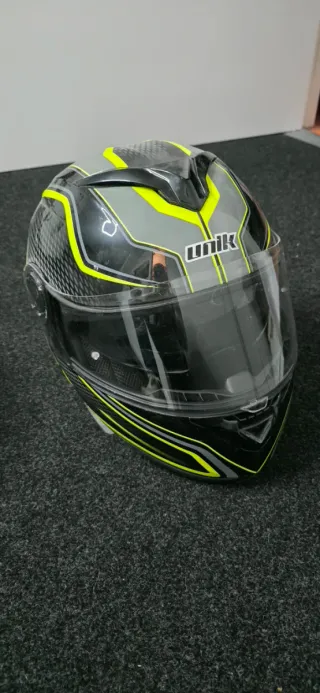 Casco modular de la marca Unik con un diseño moderno en gris y detalles en amarillo. - Diseño deportivo. - Acabado brillante.