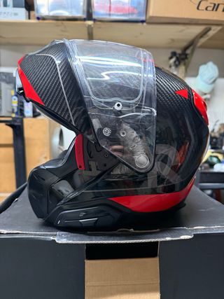Casco modular HJC con acabado en fibra de carbono y detalles en rojo. Diseño deportivo y moderno. Casco modular solo utilizado 2 veces, esta impecable, tiene intercomunicador sena integrado, tiene todas las homologaciones existentes a dia de hoy - Material exterior en fibra de carbono. - Detalles en color rojo. - Visera transparente.