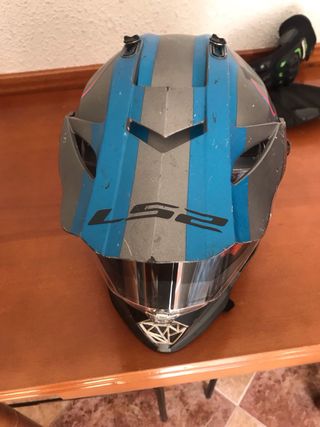 Casco de moto para trail, marca LS2, talla L. Diseño moderno con franjas azules y grises. - Visera con acabado reflectante.y con pantalla solar - Sistema de ventilación. - Cierre de seguridad.