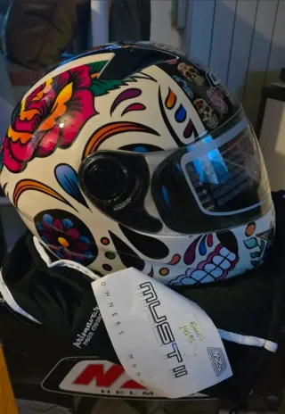 Casco integral NZI Helmets con un llamativo diseño de calaveras mexicanas y flores. - Diseño colorido estilo Día de Muertos. - Cierre de seguridad. - Visera transparente. - Sin estrenar.