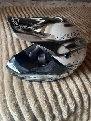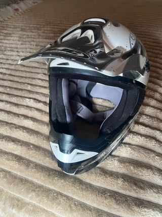 Casco de motocross Big FF en buen estado. - Marca: Big FF - Diseño: Estampado de estrella - Color: Negro con detalles blancos y azules - Incluye visera