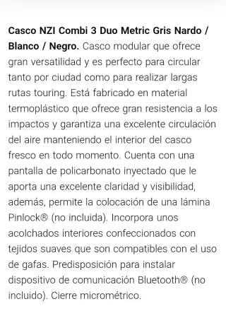 Casco de moto modular abatible en color gris metalizado, talla estándar (aprox. M/L). ✔ Pantalla transparente con buena visibilidad ✔ Sistema de apertura frontal (modular) ✔ Interior acolchado, cómodo y limpio ✔ Cierre rápido ajustable con hebilla roja ✔ Entradas de aire superiores y traseras para mejor ventilación 📌 En buen estado general, sin golpes ni grietas. Perfecto como casco de repuesto, para pasajero o uso diario.