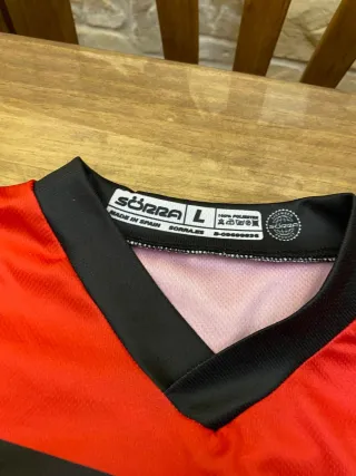 Conjunto de trial de la marca Sorra, talla L. Diseñado para la práctica de trial. - Camiseta de manga larga. - Diseño en color rojo y negro. - Logo de Sorra en el pecho. - Inscripción PRO CLOTHING GEAR en el pecho. - Inscripción SORRA en las mangas. - Inscripción RACING TEAM RIDER en las mangas.