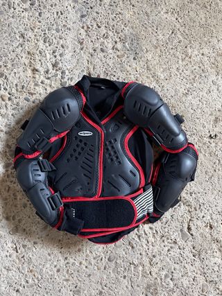 Peto de protección para moto de la marca Off Parts. - Color negro con detalles en rojo. - Talla XL. - Cierre ajustable en cintura.