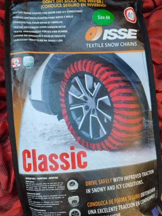 Cadenas de nieve textiles ISSE Classic, talla 66. Ideales para condiciones de nieve y hielo. - Marca: ISSE - Modelo: Classic - Talla: 66 - Tipo: Cadenas textiles para nieve y hielo Usadas una vez, están bien pero la costura del centro se debe rehacer, ver en fotos