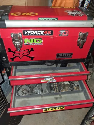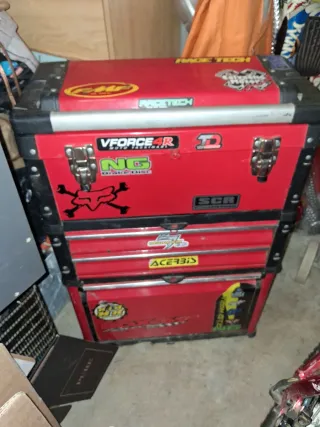 Carro de herramientas de color rojo, con varios compartimentos y cajones. Con ruedas y asa de transporte. - Diseño robusto. - Adhesivos decorativos de marcas deportivas.