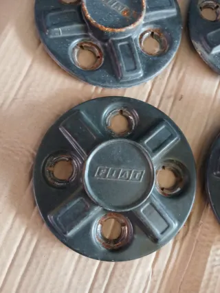 Set de 4 tapacubos para Fiat 133. Presentan el logo de Fiat en el centro. - Color negro. - Diseño con 5 agujeros. - Muestran signos de óxido en el centro.