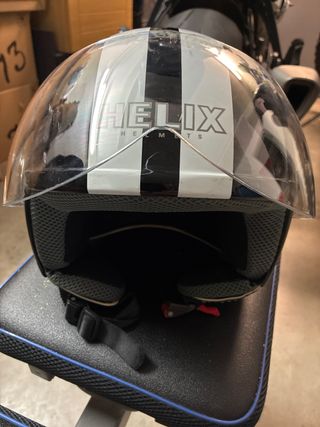 Casco de moto Nzi modelo Jet. - Talla XS. - Diseño con franjas blancas y negras. - Visera transparente. - Muy poco uso