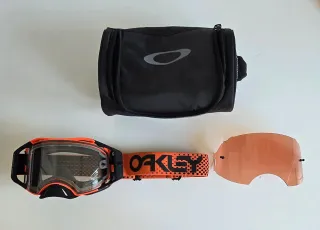 Gafas Oakley Airbrake MX originales para motocross/enduro/MTB. Sistema Switchlock para cambio de lente ultrarrápido. Lente de Plutonite rígida (máxima protección). Incluye: Gafas (Marco Naranja/Negro). Lente Prizm Bronze (mejora el contraste en tierra) + Lente Clear (transparente) nuevas. Estuche rígido Oakley original + bolsa de microfibra. Manuales y documentación.