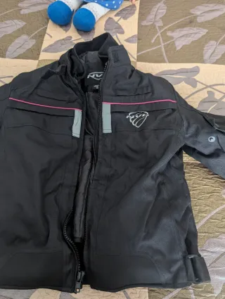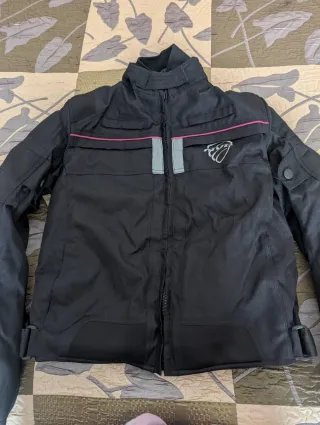 Chaqueta de moto diseñada para mujer, con detalles en color rosa. - Cierre frontal con cremallera. - Bolsillos en la parte frontal superior. - Detalles reflectantes en la zona del pecho. - Logo de la marca en el lateral derecho. - Ajustes en los laterales inferiores. Marca Acerbos Chaqueta 4 estaciones con ajuste deportivo,clase AA Protección en hombros,codos y espalda Forro térmico extraíble Sin estrenar Talla puede dar para 36-38-40 Está arrugada de estar guardada