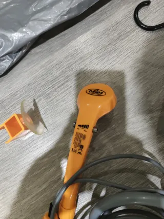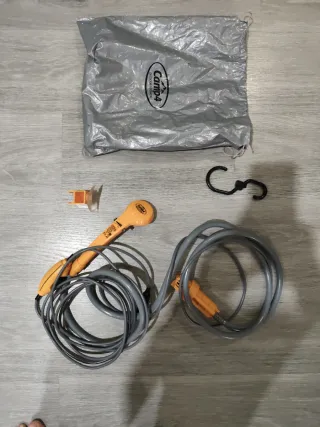 Práctica ducha exterior portátil, ideal para usar en tu camper o autocaravana. Incluye todos los accesorios necesarios para su instalación y uso. - Manguera gris enrollada. - Cabezal de ducha naranja. - Bolsa de transporte gris con logo Camp4.