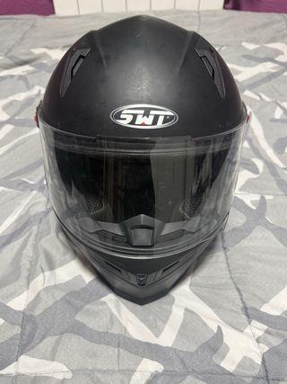 Casco de motocicleta SWT en color negro y talla M. Diseñado para ofrecer protección y comodidad. - Diseño aerodinámico. - Visera transparente. - Ventilación superior.