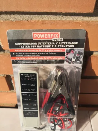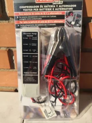 Comprobador de batería y alternador para vehículos de 12V. Permite verificar el estado de carga y el funcionamiento del alternador. - Conexión cómoda con 2 pinzas. - Protegido contra cortocircuitos. - Indicadores de carga: OVERLOAD, Charging at MAXIMUM, Charging OK, Fully charged, Half charged, Charge very low. - Test para baterías y alternadores de 12 Volt.