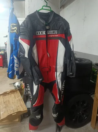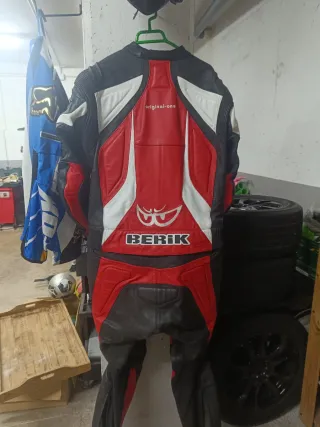 Mono de cuero de dos piezas de la marca Berik original-one. - Color negro, rojo y blanco. - Diseño deportivo.