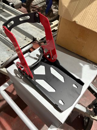 Soporte de transporte para moto, diseñado para su uso en remolques. - Fabricado en metal resistente. - Color rojo y negro.