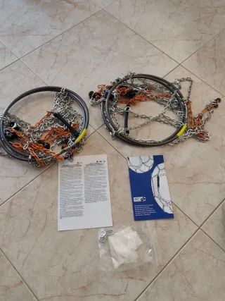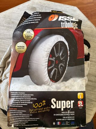 Fundas textiles antideslizantes para nieve y hielo, modelo ISSE Super Tribologic. Usadas 100 metros. - Fabricadas 100% en tela, sin partes metálicas. - No dañan los neumáticos ni causan vibraciones. - Fáciles y rápidas de instalar. - Reutilizables y lavables. - Incluyen guantes y bolsa de almacenamiento. - Fabricadas en Europa.
