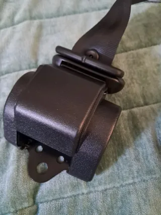 Cinturón de seguridad trasero de color negro. - Hebilla de plástico resistente. - Correa de nylon. - Soporte metálico para anclaje.