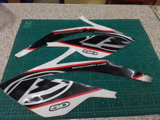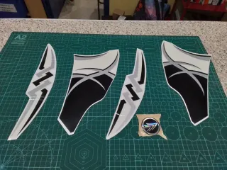Set de adhesivos para la parte frontal de una Keeway. Incluye un pequeño logo adicionales Desconozco para que modelo es - Diseño moderno en blanco, negro y gris. - Adhesivo con acabado holográfico.