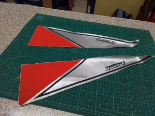 Set de adhesivos para moto Derbi Cincuenta. Según tengo referenciado son del deposito de la DERBI FDX Tiene tiempo almacenados - Diseño triangular rojo y plateado. - Detalle del logo Cincuenta en negro.