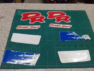 Kit de adhesivos para Suzuki DR BIG 50. Tienen tiempo almacenados - Incluye adhesivos 'RR' en rojo con borde blanco. - Incluye adhesivos 'Dual Sport' en rojo. - Incluye dos adhesivos grandes con diseño azul y blanco desgastado.