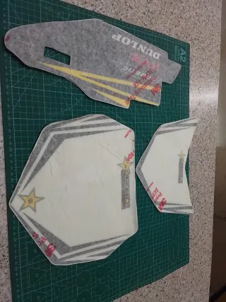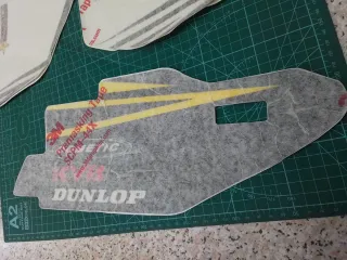 Restos de adhesivos para Pit Bike, incluyendo marca Dunlop. - Adhesivo de pre-masking 3M SCPM-44X. - Diseño con líneas amarillas y logo Rockstar.