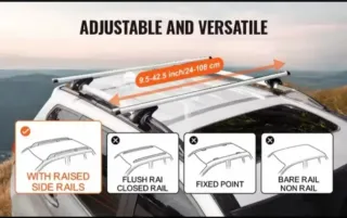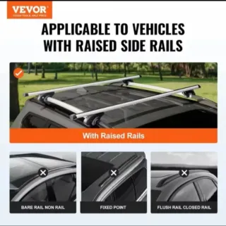 Barras portaequipajes universales de la marca Vevor, ideales para transportar bolsas de equipaje o baúles en el techo de su vehículo. Diseñadas para vehículos con rieles laterales elevados, donde se introduce su garra. Características: - Compatibles con vehículos con rieles laterales elevados. - Material: Aluminio. - 2 barras de 120cm de largo, con sus correspondientes garras engomadas. - Cierre de seguridad antirrobo en cada garra y 2 llaves para su apertura. - Amplitud máxima externa entre las barras debe ser 108cm.