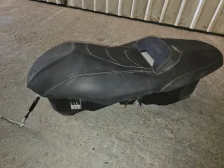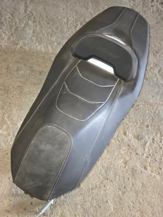 Asiento y cofre para Yamaha XMAX del año 2020. El asiento es de color negro con costuras blancas y un pequeño respaldo con el logo XMAX. El cofre está integrado bajo el asiento. Esta en perfecto estado solo sucio de estar guerdado - Material del asiento: Polipiel. - Color: Negro. - Compatible con Yamaha XMAX 2020.
