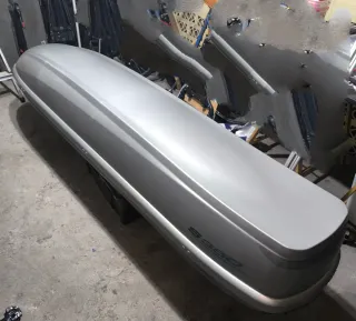 Cofre de techo plateado, modelo S350. Ideal para transportar equipaje adicional. - Color plateado. - Diseño aerodinámico. - Tiene una pequeña grieta en un lateral pero reparable.( Posible reparación grieta para venta) -Tamaño: 2,2m de largo, 50cm alto y 38 alto - Cerradura con llave