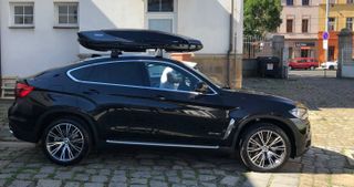Cofre o baúl de techo BMW en color negro y gris, con baca portaequipajes original incluida. Diseño aerodinámico y espacioso de 420 litros.