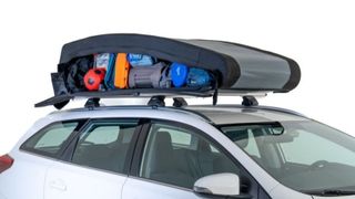 Cofre de techo plegable NORAUTO Bermude Flex de tela gris 540L. Se puede pleagar un guardar fácilmente.