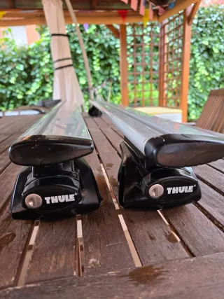 Juego de barras de techo Thule, diseñadas para mejorar la capacidad de carga de tu vehículo. Funciona perfectamente con las llaves. También tengo un cofre de techo que se vende por separado y que es compatible con estas barras. - Barras de color negro. - Incluye soportes de fijación.