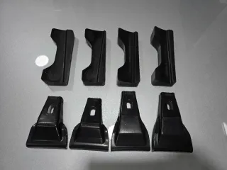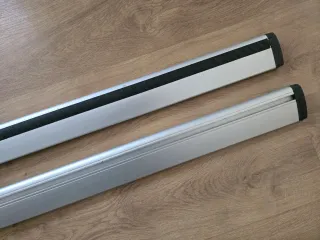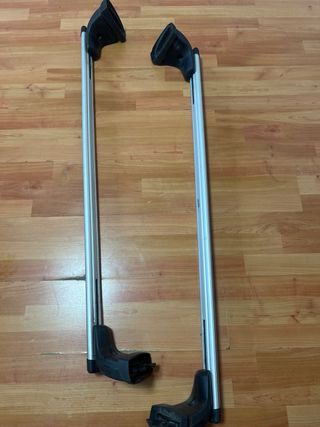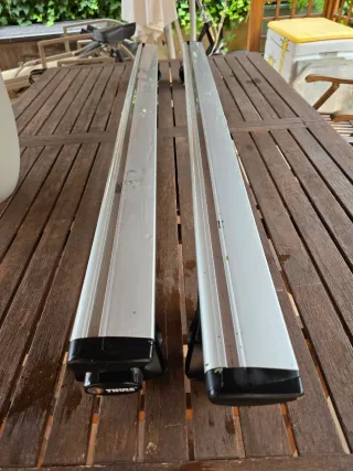 Conjunto de barras y fijaciones Thule, incluye: - Barras de techo Thule WingBar de aluminio (135 cm) – Juego de 2. Modelo anterior al Thule WingBar Evo de referencia 962100, totalmente compatible. Sin gomas. Con marcas de uso. Ideales para portabicicletas, cofres o portaesquís. - Fijaciones Thule Rapid Railing 757 – Juego completo (4 piezas). Modelo anterior al Thule Raised Rail Evo 710410, totalmente compatible. Válidas para coches con barras longitudinales elevadas. Con cerradura antirrobo y 2 llaves incluidas.