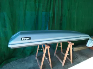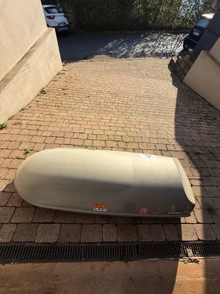 Cofre de techo Thule modelo 600, ideal para transportar equipaje adicional. - Diseño aerodinámico. - Color gris claro. - Apertura por detrás ideal para llevar los esquís. - Tengo sus soportes de anclaje a la baca - Las llaves no las tengo.