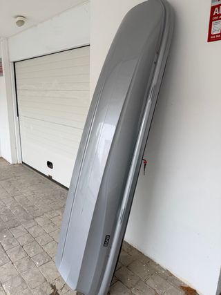 Cofre de techo marca BMW, fabricado por Thule. Muy ligero y aerodinámico. En color gris y con una capacidad de 320l. Con cerradura, se entregan dos llaves. Dimensiones: Largo: 220cm Ancho: 55cm Alto: 35cm. Esta usado, pero en muy buen estado. Tiene pequeñas marcas del uso. Se ha utilizado para viajes a la nieve. Los anclajes que utilizan son para barras con carril, ver foto 10 (no se incluyen las barras)
