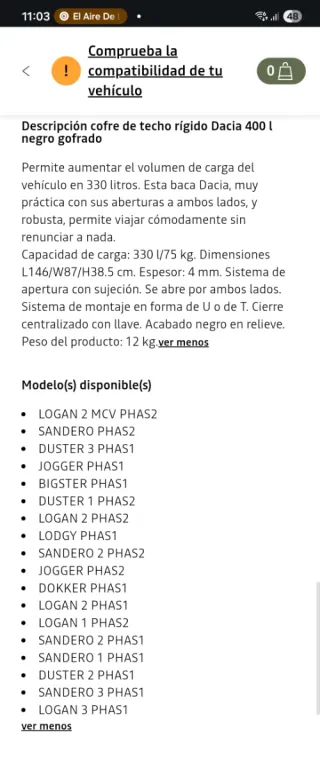❌PRECIO NO NEGOCIABLE NADA!❌ 🚫 BLOQUEO TODOS LOS PRIVADOS CON REGATEOS Y CAMBIOS🚫 Cofre baúl de techo rígido Dacia 400 litros en color negro gofrado. TOTALMENTE NUEVO, SIN USO. En las fotos se puede ver los coches Dacia compatibles. Vendo porque me lo regalaron al comprar el coche y no voy a darle uso.