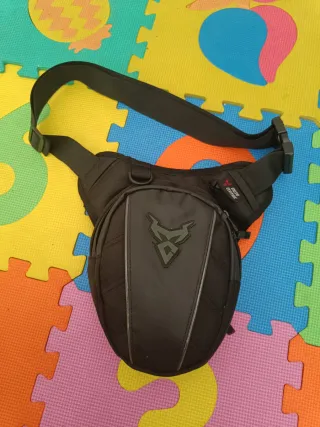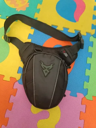 Bolso de pierna diseñado para motoristas. Es de color negro y cuenta con un logo distintivo. - Correa ajustable para la cintura y el muslo. - Compartimento principal con cremallera. - Bolsillo frontal adicional. - Material resistente.