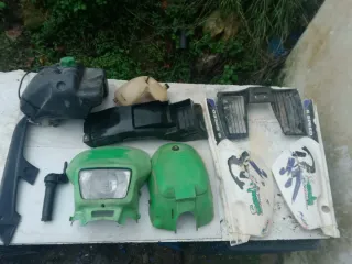 Piezas de despiece para Derbi Senda R. Incluye varias partes de la moto. - Depósito de combustible negro con tapón verde. - Faro delantero verde. - Manillar con puño. - Plásticos negros. - Plásticos blancos con diseño gráfico. - Rejilla frontal negra.