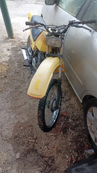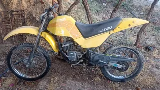 Moto Suzuki estilo enduro con caja de cambios manual. Tiene el carburador roto - Color amarillo. -para recambios o hacerla historica