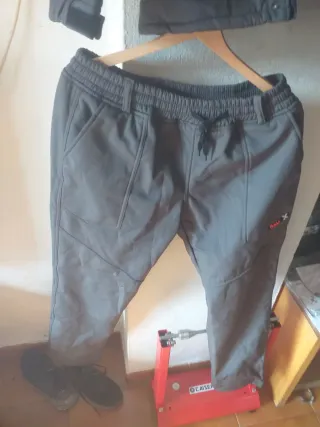 Conjunto de ropa para moto, ideal para condiciones de agua o invierno. Incluye chaqueta y pantalón. - Chaqueta de color oscuro. - Pantalón de color oscuro con detalles naranjas.