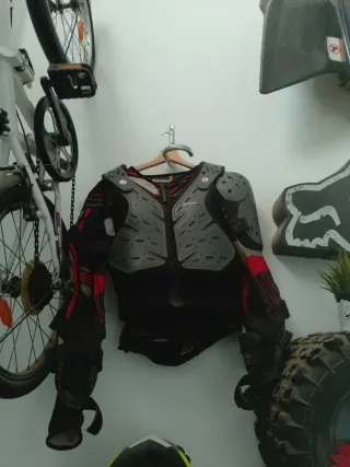Peto protector para moto con diseño en negro, gris y detalles rojos. Ideal para la protección en la conducción - Protección completo, delante,espalda, clavicula,codo, hombros. - Cierre frontal con cremallera Talla la que ves en la foto de la etiketa