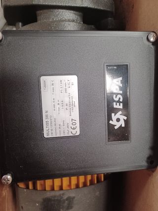 Bomba ESPA MULTI55 3M N. - Modelo: MULTI55 3M N - Referencia: T-00006 - Caudal: 66-333 l/min - Altura máxima: 38 m - Tensión: 230V.1 50Hz - Condensador: 30µF-450V - Potencia: 2,1 kW - Velocidad: 2800 min.-1 - Fabricante: Bombas Eléctricas S.A. - Fabricado en: SPAIN