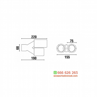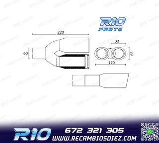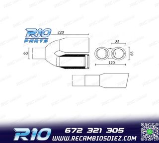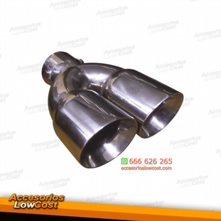 REF: AL001020 Cola de escape universal con doble salida (modelo 06). Fabricada en acero inoxidable da alta calidad. Validas para todos modelos: Instalación sencilla, sin modificación alguna del vehículo. Medidas: Diámetro entrada: 53 interior / 55 exterior mm. Diametro salidas: 85x65 mm. Largo total: 220 mm. Fabricación alemana, garantía 100%. COLA ESCAPE UNIVERSAL EN INOX CON DOBLE SALIDA