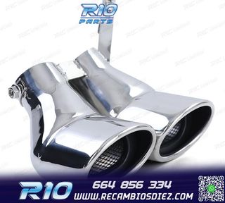 Set de dos colas de escape cromadas con diseño doble. (No se venden sueltas) - Acabado brillante. - Material metálico. - Diseño cónico. 60mm in diámetro interior 89mm out diámetro exterior 180mm ancho cola escape Aceptaría cambio por colas tipo rs3, rs4, rs6