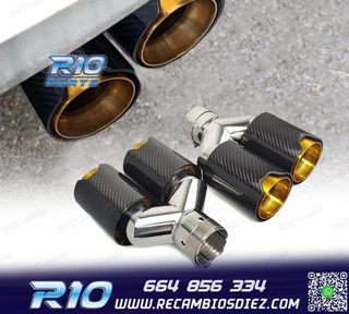 Móvil: 664 856 334 - Referencia: ESC010119. COLAS ESCAPE BMW LOOK M PERFORMANCE DORADO CARBONO Especificaciones: Modelo: Look M Performance Lado de montaje: Izquierda / Derecha Tipo de salida: Doble Color: Dorado / Carbono Diámetro de entrada Interior: 60 mm Exterior: 64 mm Diámetro cada salida exterior: 94mm Largo: 250 mm Ancho total: 190 mm Montaje. Fácil instalación sin modificar nada en el vehículo. Kit completo. Incluye las 2 colas de escape listas para instalar. Estos no son productos originales de la marca BMW. El artículo ofrecido, solo es compatible para los modelos d
