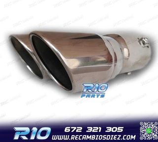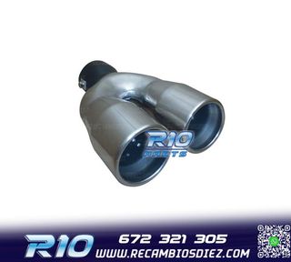 Móvel: 672 321 305 - Referencia: ESC000316. COLA ESCAPE DOBLE REDONDA Especificaciones: Modelo: Doble redonda Material: Acero inoxidable Medida: 240 mm (largo) 170 mm (ancho) Diámetro de entrada: 60 mm Montaje. Instalación sencilla, sujección mediante tornillo o punto de soldadura Imagen. Dale un toque más deportivo al vehículo con esta cola de escape