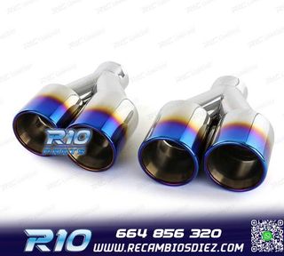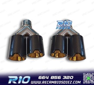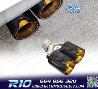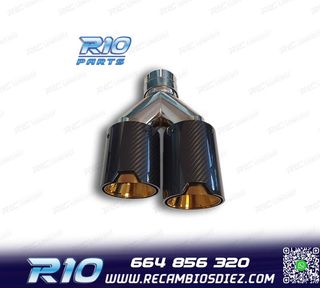 Móvil: 664 856 320 - Referencia: ESC010119. COLAS ESCAPE BMW LOOK M PERFORMANCE DORADO CARBONO Especificaciones: Modelo: Look M Performance Lado de montaje: Izquierda / Derecha Tipo de salida: Doble Color: Dorado / Carbono Diámetro de entrada Interior: 60 mm Exterior: 64 mm Diámetro cada salida exterior: 94mm Largo: 250 mm Ancho total: 190 mm Montaje. Fácil instalación sin modificar nada en el vehículo. Kit completo. Incluye las 2 colas de escape listas para instalar. Estos no son productos originales de la marca BMW. El artículo ofrecido, solo es compatible para los modelos d