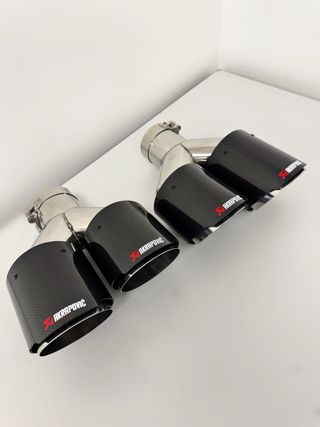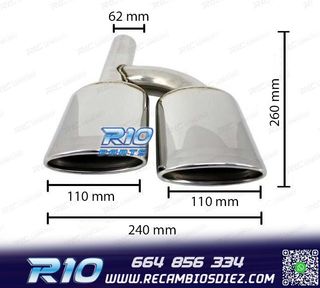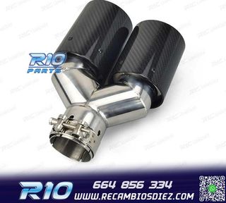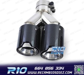 !El precio por el juego de dos unidades! Características Construcción: acero inoxidable + cubierta de fibra de carbono Diametro de entrada: Ø63 mm (universal con adaptadores) Diámetro de salida: Ø102 mm (cada boca) Longitud: 250 mm Acabados: Brillo / Mate Fijación: abrazadera incluida o soldadura (recomendado taller) Compatibilidad (ejemplos populares en España) Golf GTI/R • SEAT León FR/Cupra • Audi A3/ A4 2.0 TFSI • BMW Serie 3/4 320i-430i • Mercedes Clase C C200-C300 • Skoda Octavia RS • Honda Civic 1.5T, y otros con salida aprox. 60-63 mm. Si tu tubo es 55-57 mm, usa adaptador; si es 70+ mm, consulta otros modelos.
