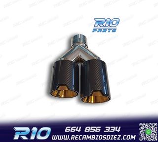 Móvil: 664 856 334 - Referencia: ESC010121. COLA ESCAPE IZQ BMW LOOK M PERFORMANCE DORADO CARBONO Especificaciones: Modelo: Look M Performance Lado de montaje: Izquierdo Tipo de salida: Doble Color: Dorado / Carbono Diámetro de entrada: Interior: 60 mm Exterior: 64 mm Diámetro cada salida exterior: 94mm Largo: 250 mm Ancho total: 192 mm Montaje. Fácil instalación sin modificar nada en el vehículo. Kit completo. Incluye las 2 colas de escape listas para instalar. Estos no son productos originales de la marca BMW. El artículo ofrecido, solo es compatible para los modelos de v